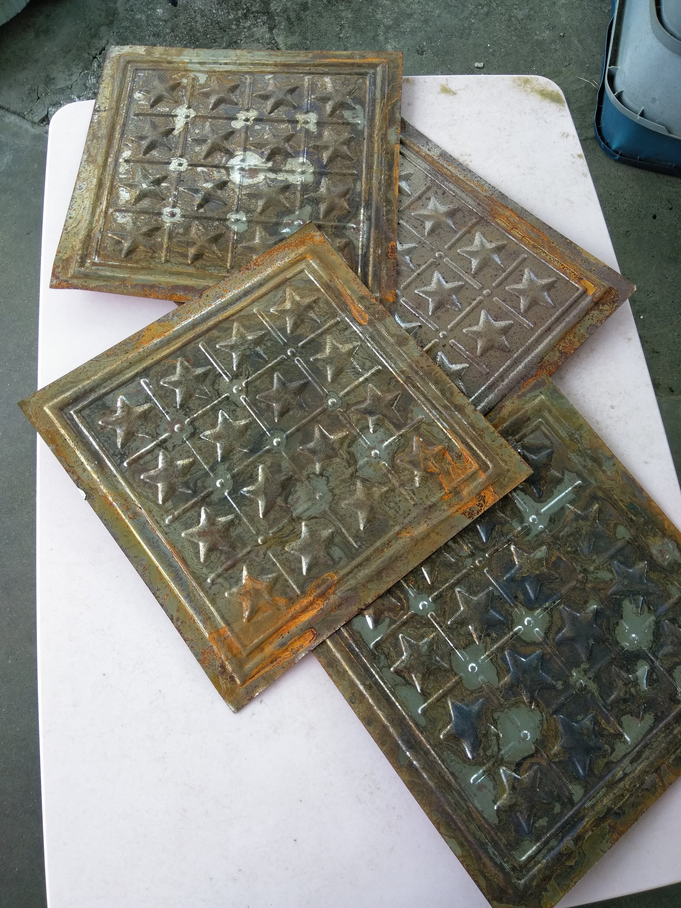 Our hand painted tin panels feature scenic, floral and figural themes. Vintage tin tile 101 from £ 33.50 excl. Each sheet measures 23.5 x 17.5 $20 per sheet. Antique tin ceiling tile, vintage architectural salvage, large blue wall decor, old pressed tin. 1 to 17 (of 17 products) pages: